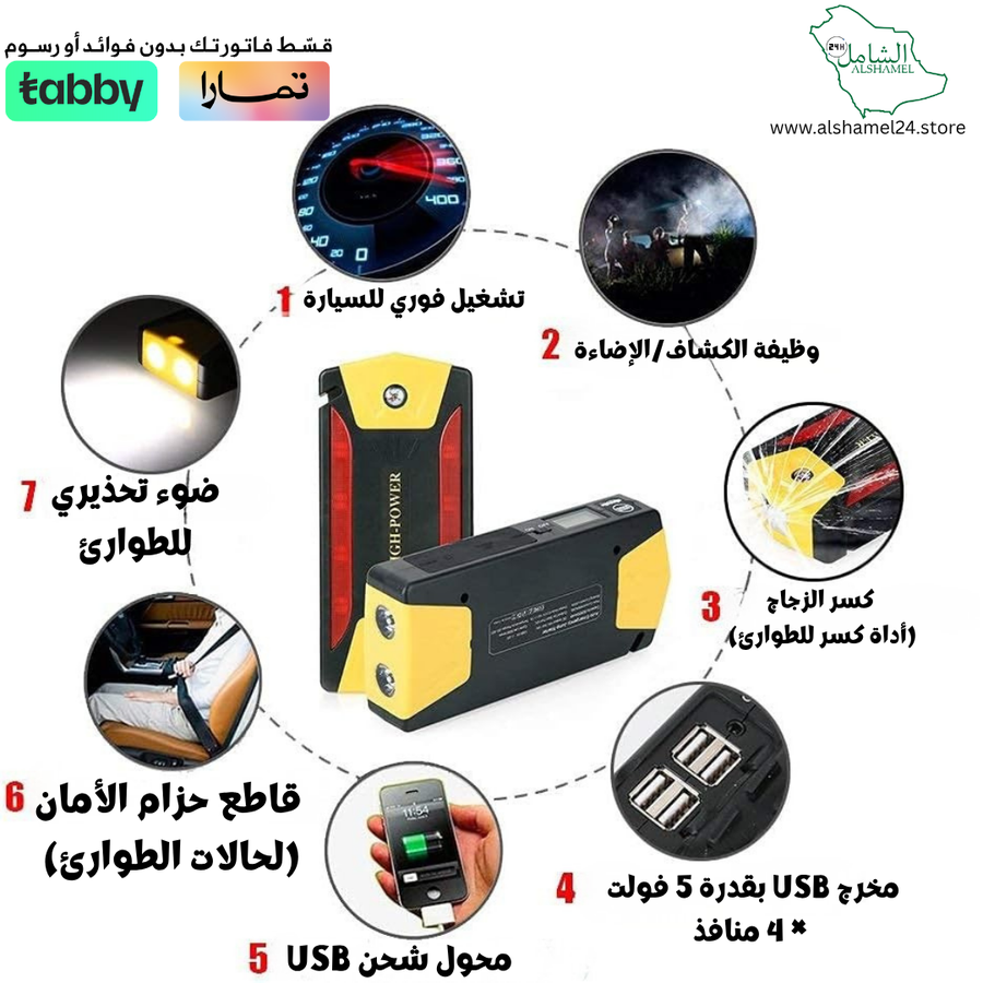 💪 حل متكامل للطوارئ — تشغيل السيارة + شحن الأجهزة + إضاءة فورية.